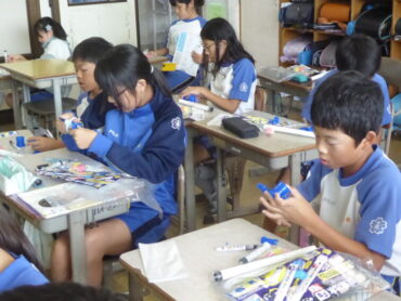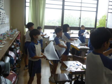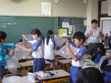 隣の教室では、理科で「とじこめた空気と水」の学習をしていました。今日は、学習に使う教材の準備やナイロン袋に空気を閉じ込めてみる活動をしていました。まずは、閉じ込めた空気を押したときの手ごたえなど、閉じ込めた空気について、これから詳しく調べていきます。