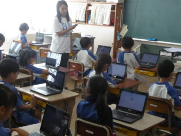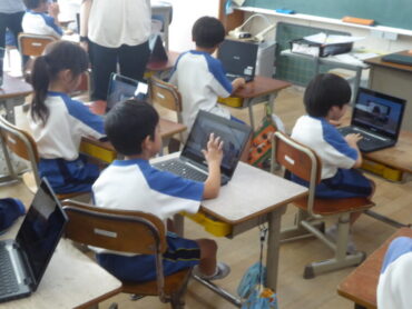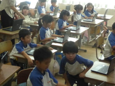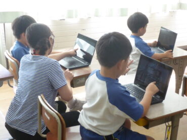 1年生が、新しい学習専用端末の使い方を練習しました。まずは、パスワードを入れて端末を起動する練習をしました。キーボードでパスワードを入力するのに苦労する子供もいましたが、全員が起動することができました。その後、カメラアプリを使って写真を撮る方法を教わり、自分で撮った自分の写真を見て大喜びしていました。