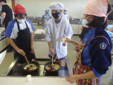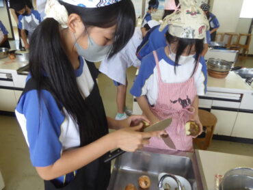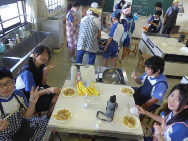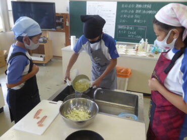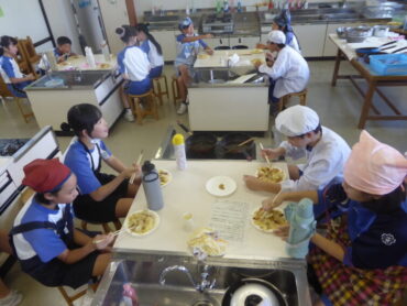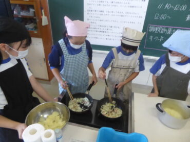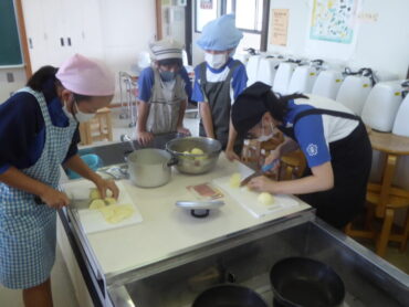 6年生は、家庭科の調理実習で「ジャーマンポテト」を作っていました。まず、包丁やピーラーを使って、ジャガイモの皮むきに挑戦しました。皮をむいたジャガイモは、厚さ5㎜程にスライスし、軽くゆでた後、ベーコン、玉ねぎと一緒に炒めました。グループで協力して作ったジャーマンポテトをおいしそうに食べていました。