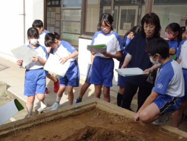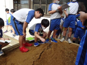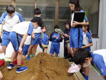 5年生が、理科「流れる水のはたらき」の学習で、流れる水の働きによって、土地がどのように変化するかを調べていました。土でつくった山に水を流し、川となった水が土地をどのように変化させるのかを実際に試してみました。傾斜のきつい上流部分では、土が大きく削られ谷のようになっていることや、土を削った水が茶色く濁っていること等、自分の目で土地の変化を確かめていました。
