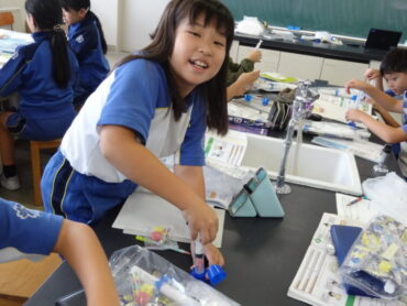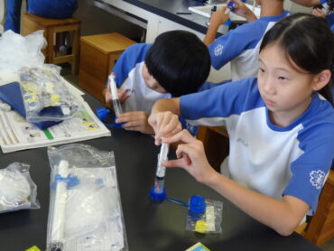 4年生の理科では、「とじこめた空気と水」の学習をしていました。ビニル袋に空気を閉じ込めた体験や空気でっぽうを使った学習で、閉じ込めた空気が押し縮められることを確かめることができたので、今日は、シリンジに空気を閉じ込め、どれくらい押し縮められるのかをシリンジの目盛りを使って確かめていました。