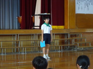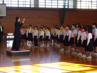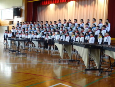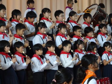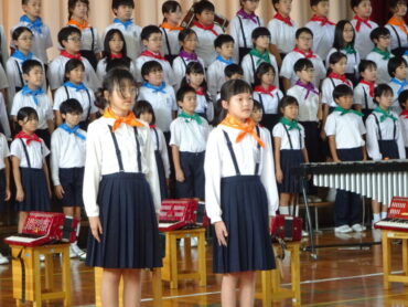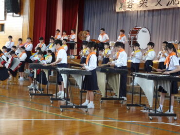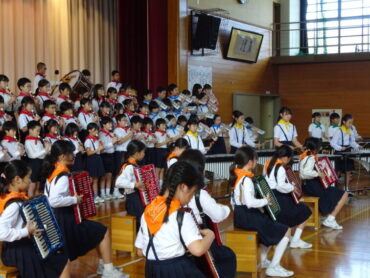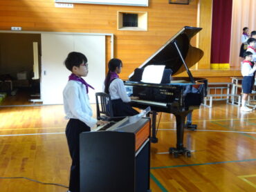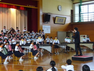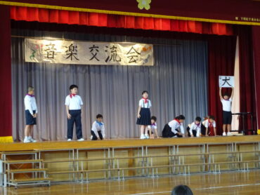 音楽会と交流会の二部構成で行い、第一部の音楽会では、それぞれの学校で時間をかけて練習をしてきた合唱と合奏を披露し合いました。二塚小学校は、合唱「変わらないもの」と合奏「宇宙戦艦ヤマト」、下関小学校が、合唱「大切なもの」と合奏「アラジン・メドレー」でした。きれいな歌声と素敵な演奏が体育館に響き渡りました。