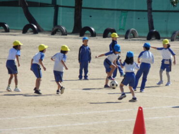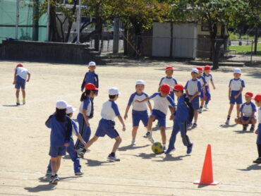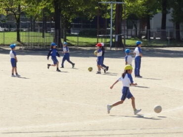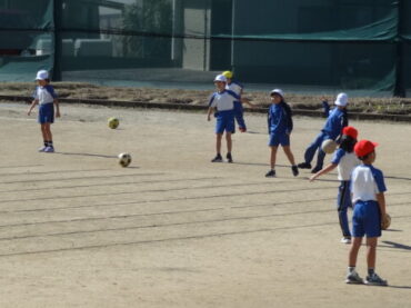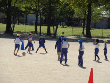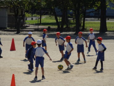 2年生が体育の学習で「サッカー」をしています。今日は、色団でパス等のボールの扱いを練習した後、初めての試合を行いました。気持ちのよい天気の中で、体を動かすことを楽しんでいました。