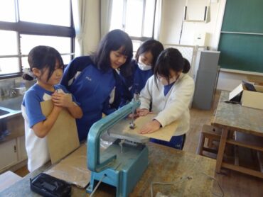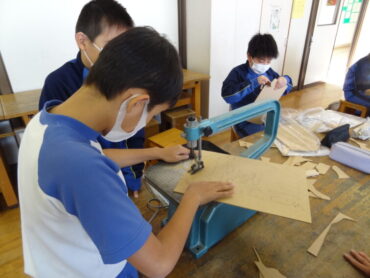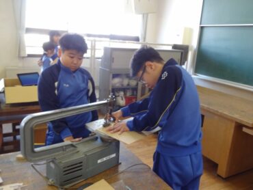 5年生の図画工作科では、メッセージボードづくりに取り組んでいます。今日は、電動糸鋸を使って、木の板を自分の作りたいメッセージボードの形に切りました。八つ切りの大きさの木の板を自分がかいた下絵に沿って、慎重に切っていましたが、電動糸鋸を使った工作は初めてなので、なかなか思うように切るのは難しそうでした。