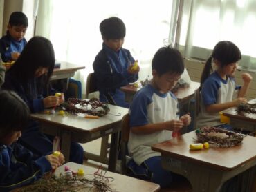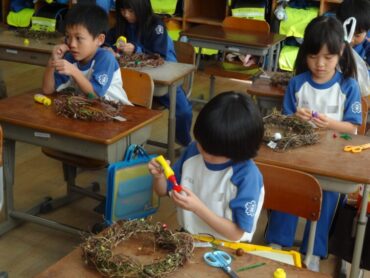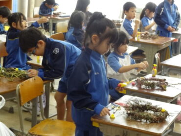 1年生は、生活科の学習でリースの飾り付けをしていました。春から育ててきた、アサガオやサツマイモの茎でつくったリースに、どんぐりや松ぼっくり、落ち葉等の自分たちで集めた秋のものや、モール等を付けて、飾り付けを楽しみました。