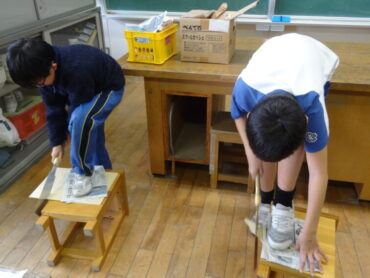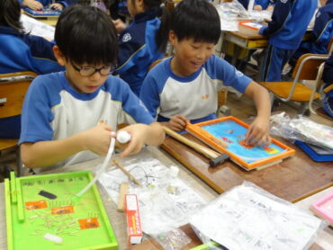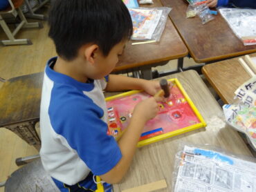 3年生の図画工作科では「トントン コロコロ ゲーム」づくりに取り組んでいます。弾いたビー玉がどのように動くのかを考えながら、釘の配置を決め、木の板に多数のくぎを打ち付けています。楽しいゲームにしようと頑張っています。