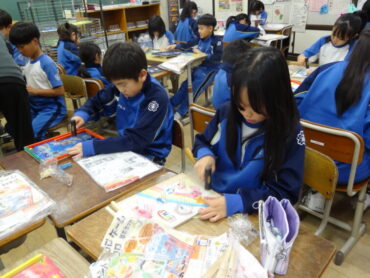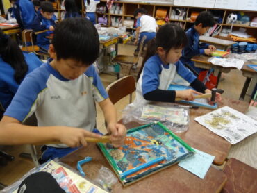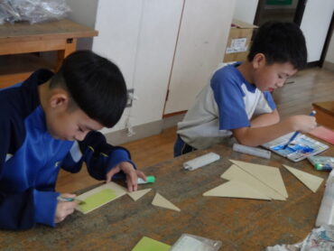 4年生は図画工作科で「カクカク板を組み合わせたら」に取り組んでいます。長方形の板をのこぎりを使って切り分け、できた形を組み合わせて作品をつくります。のこぎりで板を切ったり、板に色を付けたり、色を付けた板を組み合わせたりして、作品づくりを楽しんでいます。