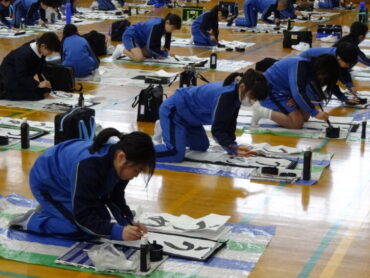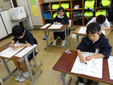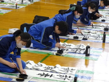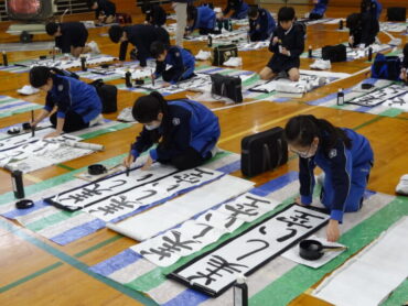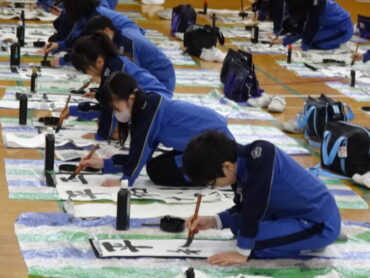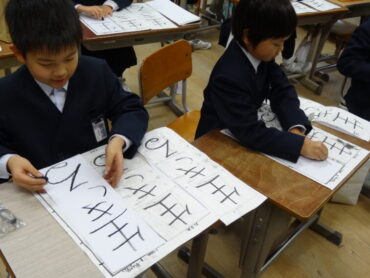 始業式の後、校内書初大会を行いました。1年は「こうま」、2年は「生きる」、3年は「うめの花」、4年は「美しい空」、5年は「平和な海」、6年は「新春の志」という字を書きました。どの学年も冬休みの練習の成果を発揮しようと、一画一画集中して書いていました。