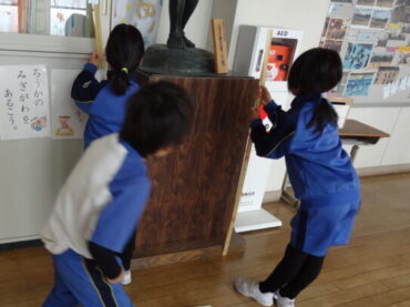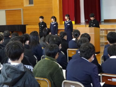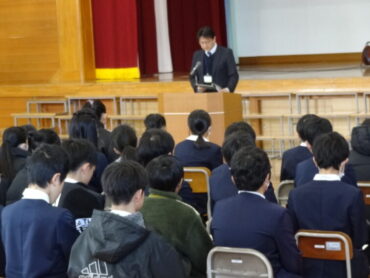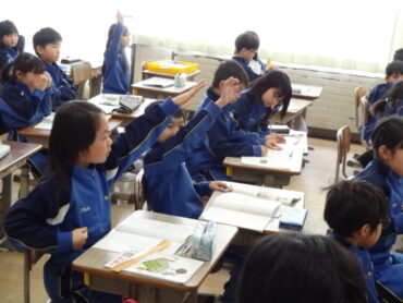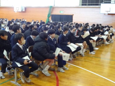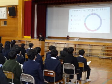 6年生は、体育館で芳野中学校の入学説明会に参加しました。お忙しい中、6年生の保護者の皆さんもご参加くださいました。芳野中学校から、先生方と4人の生徒が来校し、芳野中学校の行事や授業、部活動、生徒会活動等について説明してくださいました。