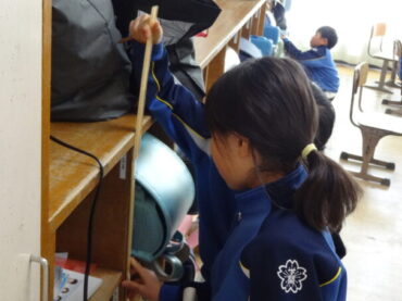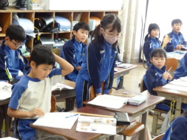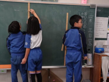 2年生は算数科で長さの学習をしています。長いものの長さの単位として、新たに「m(メートル)」を学習しました。身近にあるものの中から1mくらいの長さのものを探し、1mの竹尺を使って実際の長さを調べ、調べたものとその長さを発表しました。活動を通して、1mという長さが、どれくらいの長さなのかを感じ取りました。