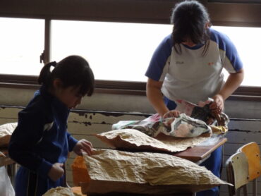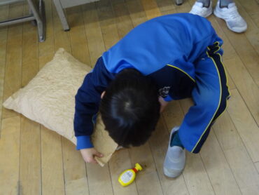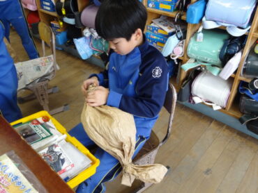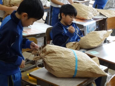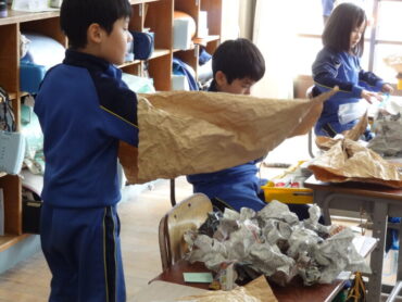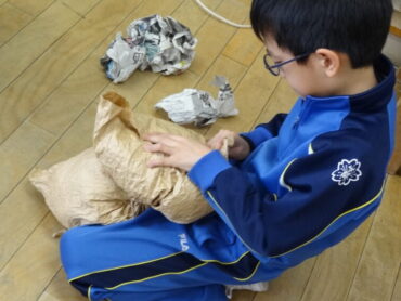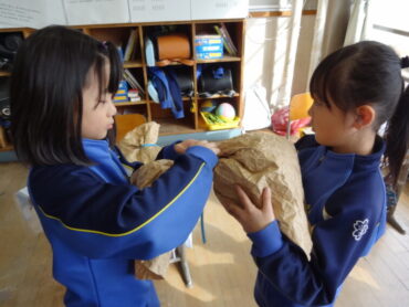 2年生の図画工作科で、工作「ぎゅっとしたい!わたしの『お友だち』」を楽しんでいました。袋状にしたクラフト紙をくしゃくしゃにして柔らかくし、その中に新聞紙を詰めてふっくらとさせ、ひもで縛ったり、飾りを付けたりして、自分のイメージした魚や動物等の「お友だち」をつくります。今日は、新聞紙を詰めて、自分のイメージに合った形にしていくところまでの活動を楽しみました。