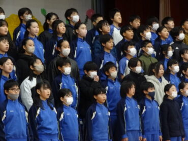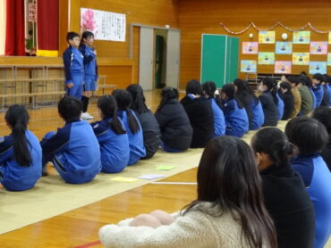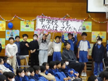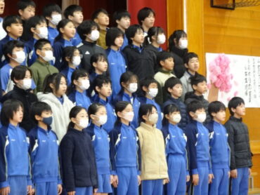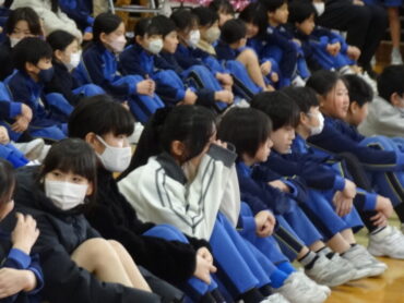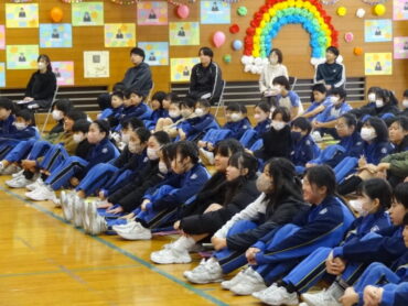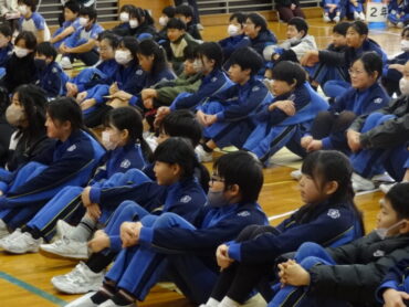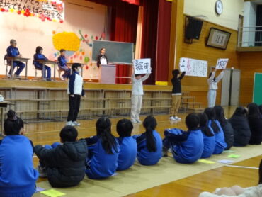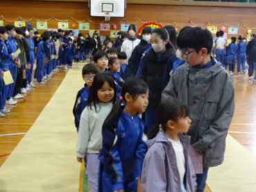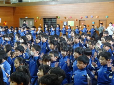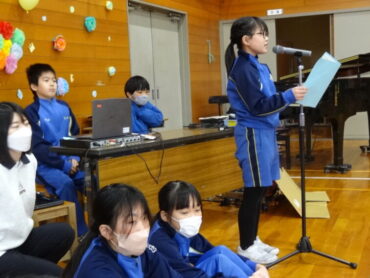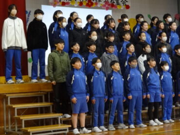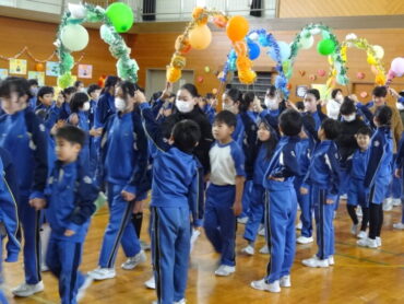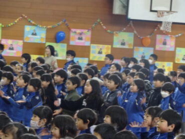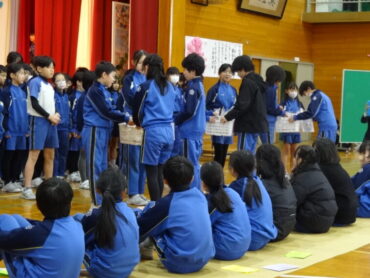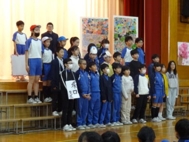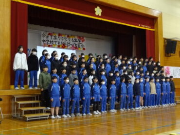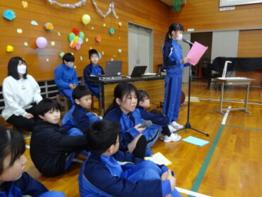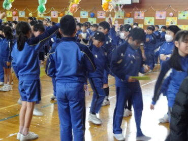 1~5年生が、お世話になった6年生に感謝の気持ちを伝えようと、6年生を招待して「今までありがとう6年生、中学校でも頑張ってね集会」を開きました。6年生の入場では、2年生がつくった招待状を手に持ち、もう一方の手を1年生に引かれながら6年生が入場しました。入場曲は3年生の生演奏でした。集会が始まり、4年生は、6年生に手づくりのプレゼントを手渡しました。5年生は、6年生の思い出をクイズを交えた楽しい劇に表しました。また、会場をきれいに飾り付けたり、集会の企画・運営をしたりと次の最高学年として下級生をリードし、心が温かくなる集会を創り上げてくれました。下級生のみんなからの歌のプレゼントでは、涙をこらえられなくなる6年生の姿もありました。最後に、6年生がお返しに歌をプレゼントしてくれました。さすがは6年生と思わせてくれる、素敵な歌声でした。6年生と下級生の心が通い合う素敵な集会となりました。